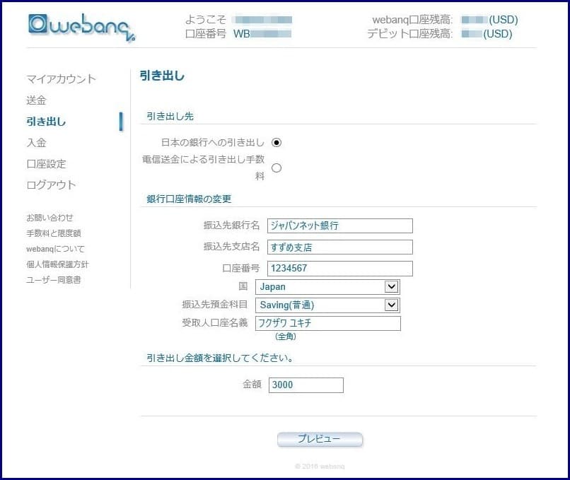 3、webanq(ウェバンク)から国内銀行への引き出し手数料: 2.49ドル (但し振込手数料は webanq負担)
